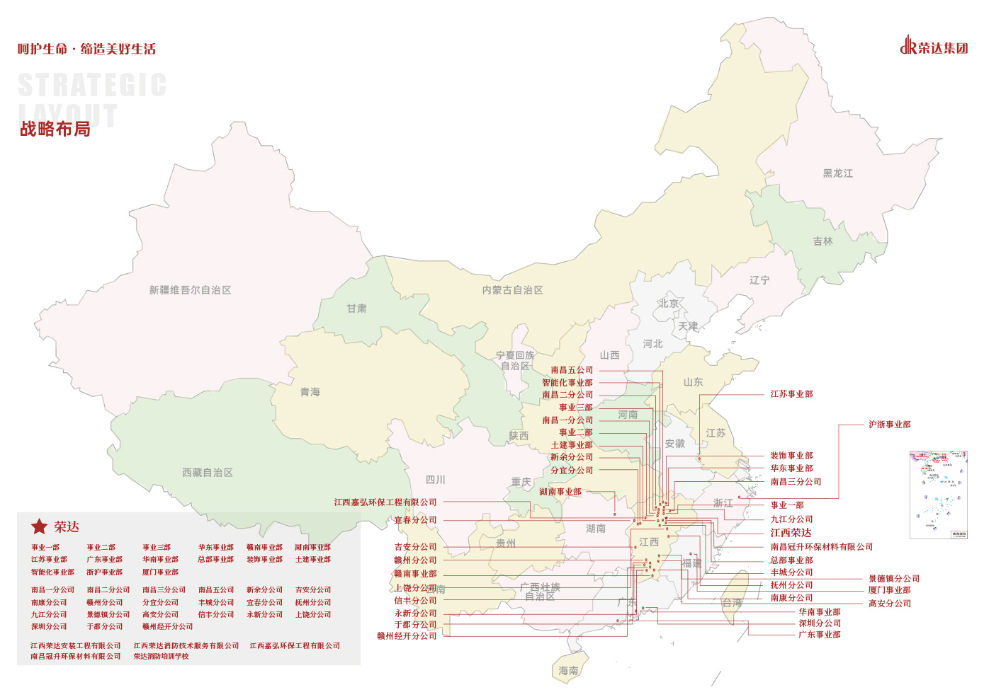 江西榮達是集機電、裝修、市政工程、總承包業務于一體的綜合型建筑企業集團。下屬榮達安裝、榮達技術、榮達培訓學校、嘉弘環保、冠升貿易五家子公司。公司業務遍布全國,2023年業務簽單10億元,員工500人,擁有執證專業技術人員336人。是江西省大的消防專業化直營企業。